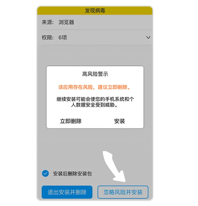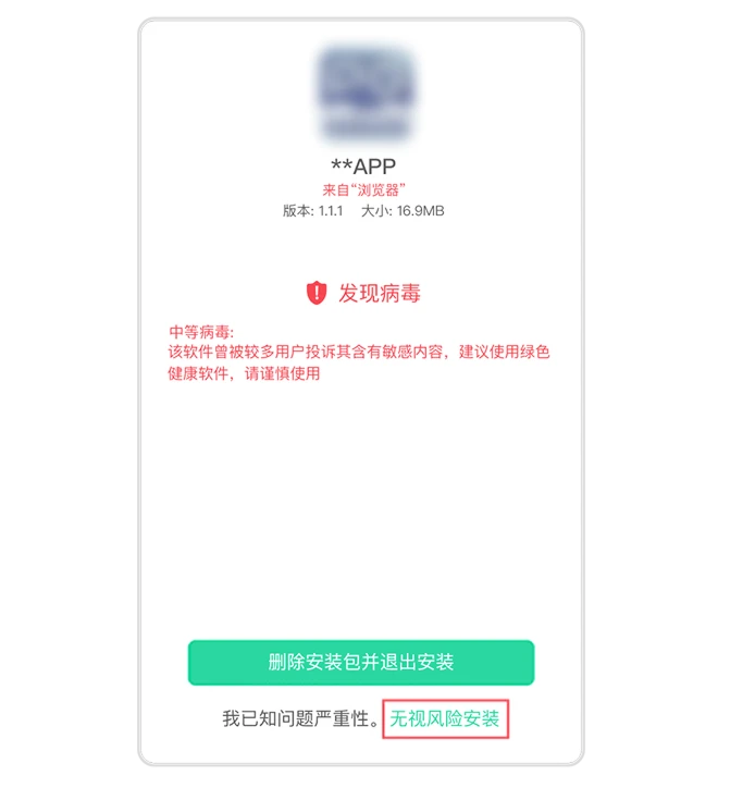 下载后会弹出「发现病毒」,请不用担心,本APP没有任何病毒,请点击「无视风险安装」